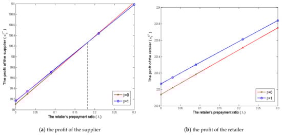 Proposition 4 (2) shows that if the retailer provides prepayment for the supplier, the retailer’s marginal profit will increase. However, it also shows (3) that the retail price does not always increase. When the market capacity is small (), the supplier will reduce the wholesale price and the retail price. Due to the small scale of the market, reducing the sales price can attract more consumers to buy products. When the market demand increases gradually, the retailer will increase the retail price. When the market capacity satisfies , the supplier still needs to lower the wholesale price to obtain the retailer’s prepayment. Only when the market capacity is large enough (), can the supplier transfer the cost by increasing the price.