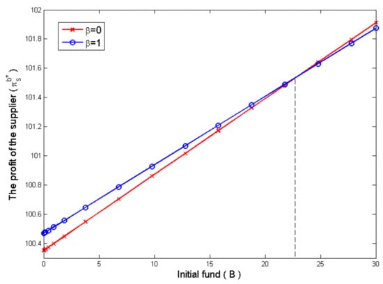 Proposition 2 (2) indicates that the supplier who has little initial capital () prefers the discounted interest rate rather than the fixed interest rate. For the supplier with little initial capital, the implementation of a discounted interest rate is necessary. However, for the supplier with relatively high initial capital (), the GCF at a discounted interest rate is not beneficial for the supplier. In this case, the supplier is willing to accept the fixed interest rate.