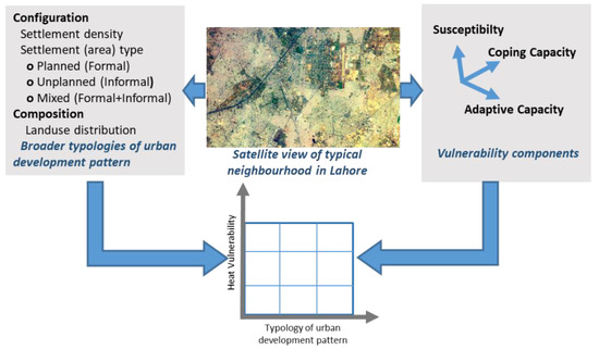 A rapidly growing canon of scientific literature exists on vulnerability assessment frameworks and methods, as well as typologies of urban development pattern and their clustering [15,29,30,31,32,33]. Missing from the current understanding is the interrelation of how metrics of vulnerability encompass the development pattern typologies of cities [16,27,34]. Because every single neighborhood within a city has its own distinct development characteristics, it is important to identify different neighborhoods based on the clustering of their relevant characteristics. To formulate and implement specific adaptation strategies, policies and measures, there is a need to establish the relevance between urban development patterns and human vulnerability. Following this discussion, this paper focuses on the use case of the metropolitan city of Lahore, Pakistan and answers the following three research questions: