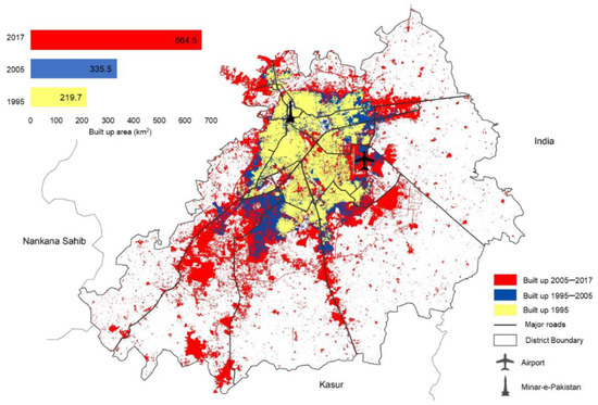 Massive urbanization, driven by the rapid expansion of the city, is one of the most dominant transformations and has characterized the growth of Lahore in recent years [68,69]. With the mix of urbanized and peri-urban areas, this metropolitan region presents a spatial variation in the dynamics of urbanization [6,69]. Figure 2 presents the built-up area of Lahore City in the years 1995, 2005, and 2017. It is evident from Figure 2 that several areas, first identified as peri-urban or even rural in 1995 and 2005, have become part of a continuous urban expansion over the years. From the graph in Figure 2, it is evident that the built-up area of Lahore increased by nearly one-third, i.e., from 220 km2 to 336 km2 between 1995 and 2005 [70]. However, this expansion doubled in the next 12 years, as an increase in built-up land was witnessed: up to 665 km2 in 2017 [70]. While the annual area growth rate in the first decade was 4.3%, it increased to 7.1% in the second period of this time frame [70].