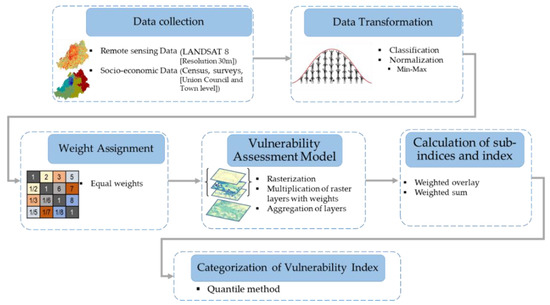 The assessment of the human heat vulnerability index for the case study is an important aspect of this research. Overall, Figure 3 summarizes the steps required for index computation. These steps range from data collection and data transformation to the weight assignment, computation, and categorization of the urban human vulnerability index in relation to heat stress.