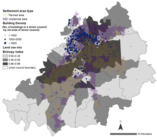 Figure 4 presents the clustering of typologies of development patterns for the case of Lahore at the spatial scale of union councils. There is a huge heterogeneity of development across the administrative units of Lahore. Based on the conceptual framework (see Section 2.2), the differentiation shown is based on settlement area types, building density, and land-use mix index. Settlement areas are grouped into developed, undeveloped, and mixed development types. Building index and ENT are categorized into three quantiles: low, medium, and high. Nearly half of the built-up areas in Lahore are undeveloped [70], where building density is quite high and land use is less diverse. Importantly, the land-use mix index is higher, and the building density ranges from low to medium in the developed areas because of the high adherence to planning regulations in these areas. Moreover, more than half of the union councils have both developed and undeveloped zones, where building density values, as well as land-use diversity, are relatively higher in these areas. According to k-mean clustering analysis, a large number of union councils in Lahore have high building density and their ENT is medium to high, which means that land use is more diverse.