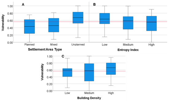 Box plots between human heat vulnerability and typologies of development pattern (settlement area type (A), entropy index (B) and building density (C)). Redline indicates the mean value of the overall vulnerability. Source: Own figure.