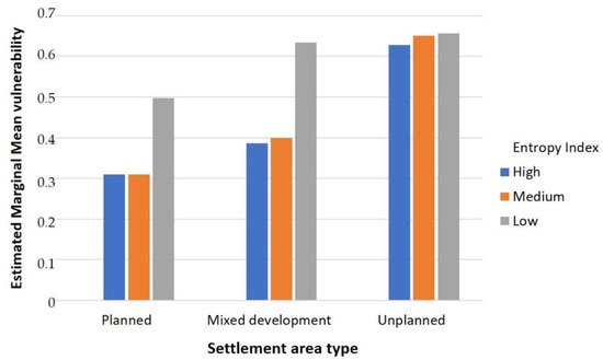 The estimated marginal means of vulnerability (y-axis) for the different development pattern typologies (x-axis) and entropy index (x-axis). Source: Own figure based on categories explained in Section 2.2.