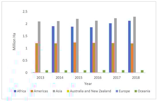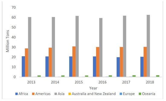 Furthermore, population growth, as well as an increase in planted area and productivity, have all contributed to the rise in banana demand. Asian countries provided the most banana production in 2018, with 62.48 million tons, followed by the United States of America and Africa (Figure 1 and Figure 2) [8]. India ranks fourth globally, with a cultivated area of 722 thousand ha and an annual output of 26.51 million tons. Following China are the Philippines, Ecuador, Brazil, and five other countries [8]. Therefore, more research of bananas is necessary; more appropriately, extensive research is necessary.