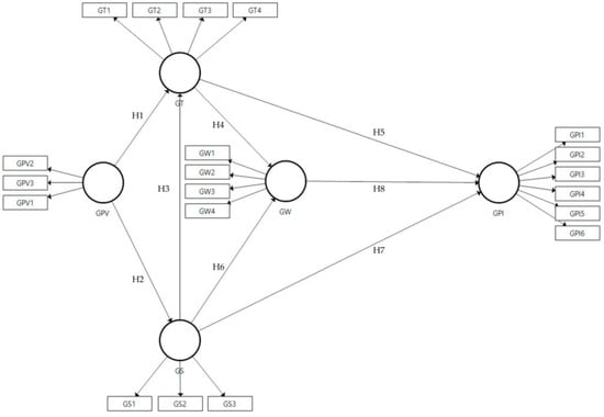 Finally, H6, which assessed the relationship of GS → GW, had a β of 0.57, the relationship of GT → GPI, H5, showed a β of 0.32, and H7, GS → GPI, yielded a result of 0.65 (see Table 6).
