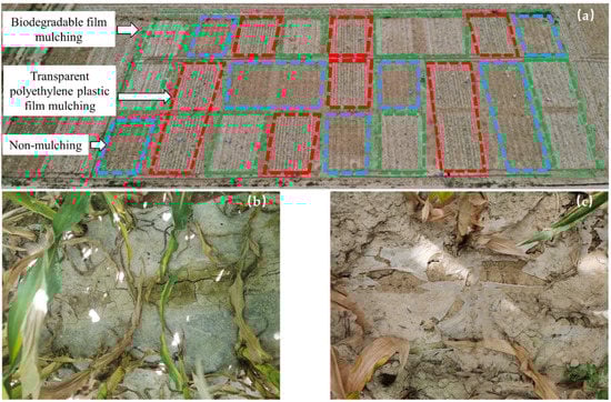 In recent years, non-polluting and environmentally friendly degradable agricultural films have been developed as a promising alternative to PE film [14]. Degradable agricultural films are generally classified into two types, photodegradable films and biodegradable films [8]. Previous studies showed that photodegradation would stop degradation if it was covered by the soil or crop canopy; thus, the degradation rate was difficult to control [15], which restricted its extensive application. Biodegradable films are produced from a biodegradable PE starch plastic substance that can be degraded by natural microorganisms such as bacteria, fungi and algae [16]. Their final metabolites are CO2 and H2O, without any pollution to the ecological environment [17,18]. Previous studies show that biodegradable films could increase soil temperature, maintain soil moisture and restrain evaporation [19], achieving higher crop yields and water productivity compared to bare soil [19,20].
