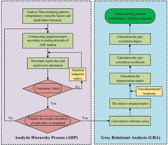 The AHP qualitatively determined three factors of benefits (i.e., economic, technical and ecological benefits) and their weights, and the GRA quantitatively analyzed the uncertain relationships among factors. A comprehensive evaluation system combining the advantages of AHP and GRA is proposed in this study to analyze the comprehensive benefits of different mulching patterns. The comprehensive benefits evaluation system is shown in Figure 2.