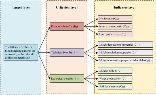 The comprehensive evaluation system is divided into three levels from top to bottom. The highest layer is the target layer. The second layer is the criterion layer for evaluating the target layer. The third layer is the specific indicator of the evaluation elements. According to the relationship between the various elements of different mulching patterns, the highest target layer was set as the impact of the different mulching patterns on comprehensive benefits. The criteria layer included the economic benefits, technical benefits and ecological benefits of the different mulching patterns. The indicator layer included the specific indicators that evaluate the economic benefits, technical benefits and ecological benefits, respectively. The comprehensive evaluation system is shown in Figure 3.