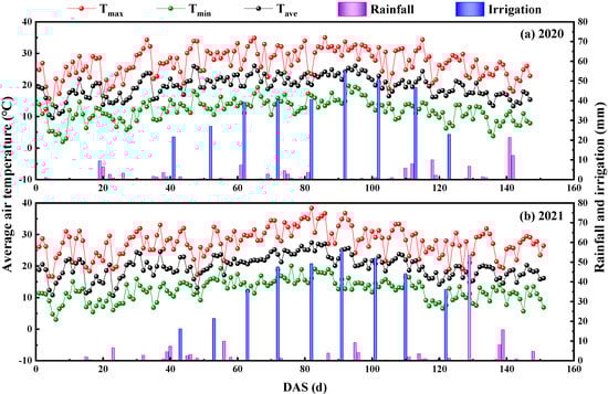 Daily rainfall amount, full irrigation amount and air temperature in 2020 (a) and 2021 (b).