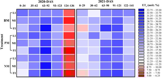 Figure 6 shows the relative ET (ETr, i.e., the ratio of ET at one specific period to the total ET during the crop growth period). From sowing to the first irrigation (41 DAS in 2020 and 43 DAS in 2021), the ETr under BM treatment was higher than under PM and NM treatments, with an average increase of 4.9% and 0.7% in 2020 and 2.1% and 0.6% in 2021, respectively. During 34 to 62 DAS in 2020 (62 to 121 DAS in 2021), the ETr in the NM treatment was 2.1% (1.4%) higher than in PM and 2.4% (1.0%) higher than in the BM treatment. During 124 to 136 DAS in 2020 (122 to 141 DAS in 2021), the ETr decreased gradually in all treatments without significant difference.