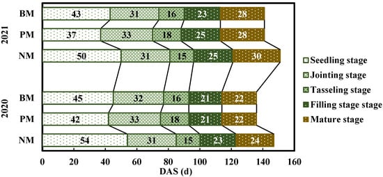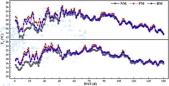 (2) The difference in the accumulation of Ts_PM–Ts_NM and Ts_BM–Ts_NM was significant during the initial stage (0 to 30 DAS) and non-significant during the middle and late stages. The SEAT under the BM treatment was 150.3 °C (8.5%) higher than the NM treatment and 72.8 °C (4.1%) lower than the PM treatment.