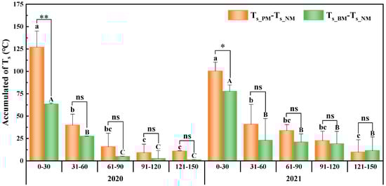 Accumulation of Ts_PM–Ts_NM (in yellow) and Ts_BM–Ts_NM (in green) during crop growth period in 2020 and 2021. Bars stand for standard error. Different lowercase (capital) letters above the bars indicate significant differences among Ts_PM–Ts_NM (Ts_BM–Ts_NM) of degradation film degradation stages at p < 0.05. * (**) represents the significant difference between Ts_PM–Ts_NM and Ts_BM–Ts_NM at the same degradation stages of degradation film at the level p < 0.05 (p < 0.01). “ns” means no significant difference. NM, PM and BM represent non-mulching, transparent polyethylene plastic film mulching and biodegradable film mulching, respectively.