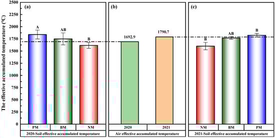 Figure 9 compares the soil effectively accumulated temperature (SEAT) under the NM, PM and BM treatments (Figure 9a,c) and the air effectively accumulated temperature (AEAT) (Figure 9b) for 2020 and 2021. The AEATs of the two growing seasons were 1692.9 and 1790.7 °C, respectively. The PM treatment had the highest SEAT, followed by BM and NM. The SEAT under BM treatment was not significantly different from the PM and NM treatments, increasing by 150.3 °C (8.5%) compared with the NM treatment and decreasing by 72.8 °C (4.1%) compared with the PM treatment. However, the SEAT under the PM treatment was 223.3 and 223.1 °C higher than in the NM treatment in 2020 and 2021, respectively, which was significantly different (p < 0.05).
