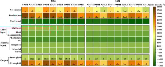 In this study, an economic analysis of maize production was performed after harvest. The input included the values of labor and materials. The labor costs included rotary tillage, sowing, harvesting and field management (weeding, fertilization, etc.). Material costs included maize seed, pesticides, fertilizers and drip irrigation facility. In the PM and BM treatments, the additional labor and material expenses are for the machine film mulching and the material cost of plastic film and biodegradable film, respectively. The output was evaluated based on the economic harvest of grain and straw yields. Total input (TI, Yuan ha−1) was calculated as:
