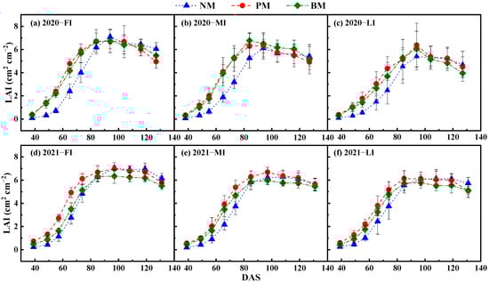 SWS to the soil depth of 1 m varied significantly in 2020 and 2021 (Table 4). At 34 DAS (2020) and 29 DAS (2021), compared with pre-sowing SWS, the SWS in the NM, PM and BM treatments were decreased by 42.4, 23.9 and 22.7 mm in 2020 and decreased by 39.1, 22.0 and 27.9 mm in 2021, respectively. The SWS of all treatments increased after sowing (with irrigation to ensure seedling emergence) and then decreased over time during 0~62 DAS. SWS was higher in FI than MI and LI during 62 to 123 DAS in 2020 (62 to 121 DAS in 2021), but there were significant differences only during 90 and 121 DAS in 2021 (p < 0.05). Based on the NM, PM and BM treatments, the SWS at 136 DAS decreased by 2.4, 2.6 and 2.8 mm compared with 123 DAS for 2020, respectively. In addition, the SWS at 141 DAS increased by 17.9, 23.1 and 14.7 mm compared with 121 DAS for 2021, respectively, which may be due to strong rainfall (53.4 mm) at 129 DAS in 2021.