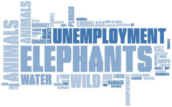 Xhumaga has a total population of about 1500. It is located at a border of Makgadikgadi National Park, which has an estimated elephant population of about 1800, often considered above the carrying capacity of the area, but in keeping with the government’s policy decisions around hunting and conservation [39,40,41]. While significant effort has gone into reducing human–wildlife conflict in the area, at the time the fieldwork was undertaken a number of things contributed to an increase in tensions. This included the destruction of the fence between the national park and the village, and an ongoing drought that dried the seasonal river serving as a natural border to the park, further resulting in animals and people using the same water source. A lack of maintenance of an alternative borehole pump meant that there were no alternative water points in the community. Crop destruction by elephants was rampant, and there was more than one reported case of people being trampled. While only indicative, the word cloud in Figure 1 draws on participant descriptions of the livelihood challenges they faced due to climate change.