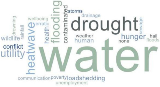 Water shortages are often faced by the community; while there are taps that provide bulk water provision, these often run dry, and households faced a range of administrative barriers to water access, such as inefficient billing systems, insufficient infrastructure maintenance, and frequent outages. The word cloud in Figure 2 reflects the challenges faced by Ramotswa due to climate change, and it illustrates core differences in context to Xhumaga, where human–wildlife conflict is a much more prominent consideration.