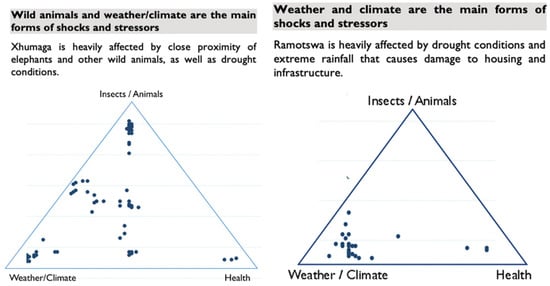 As the triads in Figure 4 demonstrate, climate is one of the biggest causes of stress in households in Ramotswa, while in Xhumaga conflicts with wild animals, which are compounded by climate, are both key causes of household stress.