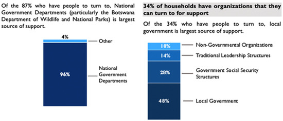 While the challenges faced by farmers are common, they are clearly experienced along gendered lines. Additionally, the sources of help participants cite as available varies by gender. Across both sites, women were far more likely to seek help from individuals, while men were more likely to find support from organizations. One of the most striking differences between the two sites is the role the government plays in supporting households that are facing shocks and stressors. Only a third of households in Ramotswa could turn to some kind of organization for support, and, of those, fewer than half would approach local government. In Xhumaga, on the other hand, 87% of households could find support from organizations, and 96% of these turned to national government departments. This is undoubtedly explained by the community’s reliance on the department of wildlife to resolve issues of livestock predation and human–wildlife conflict, which does not pose as significant a problem in Ramotswa. It also points to the scarcity of other institutions providing social support in rural areas.