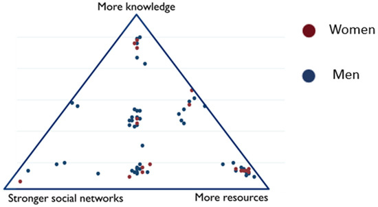 Figure 6 shows that men prioritize the tangible support of resources in adapting to climate change, while women are more likely to value knowledge and social networks. This may influence the policy guidance for household-level support to adaptation efforts.