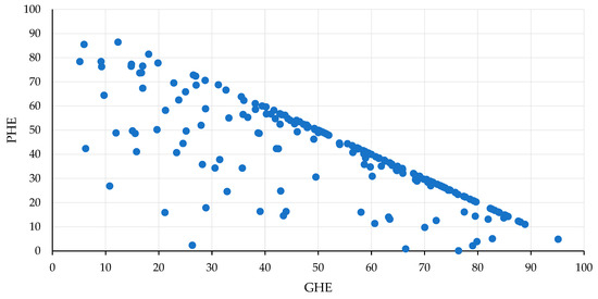 The breakdown of countries in terms of proportions of funding general health expenditure between private (PHE) and government (GHE) sources, per person, is shown in the chart below (Figure 1). It shows that there are generally all kinds of countries in the world and there are no major densities in proportion between them. The highest values of private expenditure reach 86% of total expenditure on health, which then corresponds to 14% of the share of government expenditure. However, there are countries where private spending is close to zero—all financing is then covered from their government funds [61].