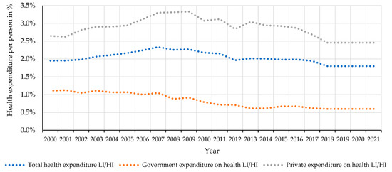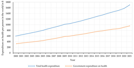 The most recent available data are presented in the above sections. It may be interesting to compare how health expenditure has changed over time. As can be seen, these expenditures show an upward trend, with government expenditures growing slower. Global spending increased from $600 per person in 2000 to $1459 per person in 2021, and government spending from $326 to $845, respectively (Figure 2) [62].