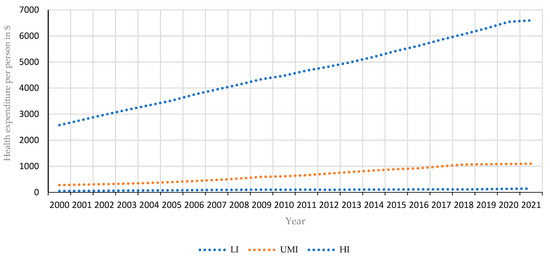 Health expenditure per person by income group (in international dollars according to purchasing power parity: LI—low-income countries, UMI—upper-middle income countries, HI—high-income countries [63].