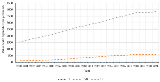 Public health expenditure per person by income group (in international dollars according to purchasing power parity) [63].