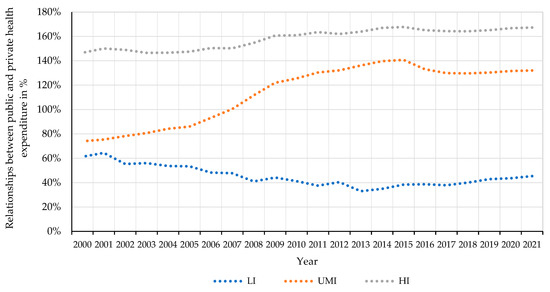 In low-income countries, the relationship between public and private expenditure over the entire studied period remains below 64%, while in high-income countries it is above 146% (Figure 5). When observing the changes within the group of upper-middle income countries, it seems that the hallmark of development may be the increasing proportion between government and private health expenditure (per person) [63,64].