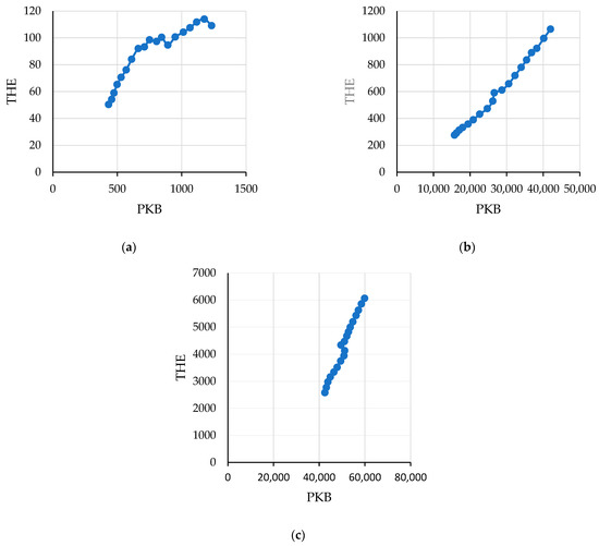 Level of GDP PPP (2019 constant prices, in billion international dollars) and total health expenditure (THE) per person PPP (in international dollars): (a) Low-income countries (LI); (b) Upper-middle income countries (UMI); (c) High-income (HI) countries [61,63].
