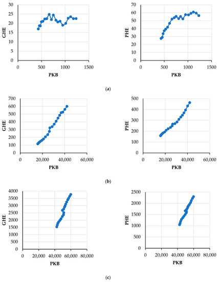 Level of GDP PPP (2019 constant prices, in billion international dollars) and health expenditure per person; government (GHE) and private (PHE) (in international PPP dollars): (a) Low-income countries (LI); (b) Upper-middle income countries (UMI); (c) High-income (HI) countries [61,63].