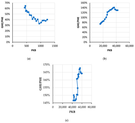 Level of GDP PPP (2019 constant prices, in billion international dollars) and the ratio of government to private expenditure on health per person PPP (in international dollars, percentage): (a) Low-income countries (LI); (b) Upper-middle income countries (UMI); (c) High-income (HI) countries [61,63].