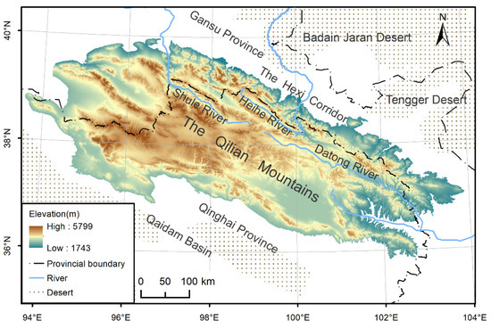 The Qilian Mountains (93.5°–103.9° E, 35.8°–40.0° N) are located at the northern margin of the Tibetan Plateau and are the representative arid and semi-arid regions of Northwest China. This region consists of parallel mountains and valleys in the northwest–southeast direction, which spans across the Gansu and Qinghai provinces (Figure 1). The rivers (the Shule River, Heihe River, and Datong River) in the arid and semi-arid areas originate from the alpine regions. Precipitation in the alpine regions is generally larger than that in plain regions [28], and regional precipitation always affects local water resources, ecology, and economic development.