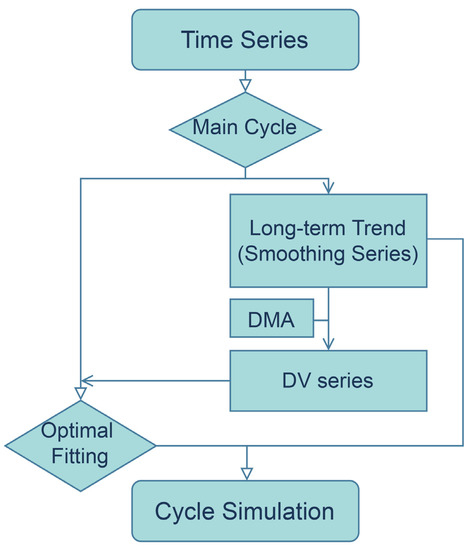 Detrended method of moving average (DMA) is used to reduce the interference of the trend on cycle analysis and to convert the non-stationary series into a stationary series [39,40,41]. The detrending procedure: first, this study applies the main cycle as a moving average parameter for smoothing the series to present the long-term trend. Then, the actual value minus the moving average to obtain the difference value (DV) series, which removes the interference of a long-term trend while retaining cycle information.