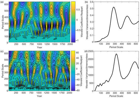 The periodic features in the paleoclimate series can be analyzed by complex Morlet wavelet, and it is conducive to recognizing the current phase of the climate. The “boundary effect” is eliminated before wavelet analysis, and the wavelet function is determined as complex Morlet (1–1.5) and the 1/3 of data length is regarded as the maximum period. The cycles of temperature (Figure 3a,b) and precipitation (Figure 3c,d) during the last 2000 years are identified through complex Morlet wavelet. The real-part of the wavelet coefficient from top to bottom corresponds to cycles from low to high frequency, and the wavelet variance diagram reflects the strength of cycles and main cycle [55].
