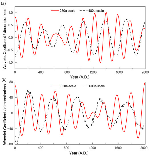 The temperature and precipitation show the quasi-periodicities of 250~350 and 400~640 years according to the distributions of the wavelet coefficient. The periodic signals of temperature are most obvious in the 280-year and 480-year scales, as shown in Figure 3b, and the wavelet variance of precipitation shows two significant peaks of 320 and 590 years, as shown in Figure 3d. The wavelet coefficients at different time scales indicate the periodic oscillation and the cycle length of temperature and precipitation (Figure 4). The 200-year and 306-year cycles of temperature are noticeable, and the 200-year and 380-year cycles are obvious in precipitation series. The main cycles of temperature and precipitation are both 200 years, indicating that the centennial-scale cycle modulates the variations of temperature and precipitation.
