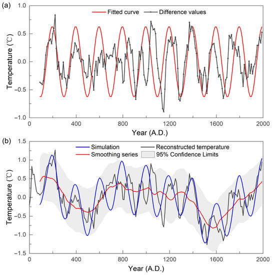 The temperature simulation with sine function: (a) the fitted series of detrended temperature series; (b) the simulated temperature and the 200-year smoothing series.
