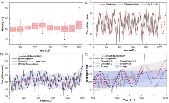 The fitted curve displays nine whole cycles and a rising stage in the tenth cycle (1900–2010 AD), and the amplitude indicates the fluctuation range of precipitation under the modulation of the main cycle. Figure 6b shows the cyclic route of detrended precipitation in the next 200 years, which eliminates the influence of the long-term precipitation trend. The simulated precipitation fluctuates around the long-term trend in a periodic form (Figure 6c), and the correlation between simulation and precipitation is 0.40 (90–2010 AD). The average precipitation is about 210 mm during the last 2000 years. In addition, the long-term trend of precipitation is relatively stable, and this is also shown in the mean values’ change in boxplots. The current precipitation is in the rising zone of the long-term trend that begins at 1540 AD; however, the rate of the rising linear trend is only 1.5 mm/10 a. The simulated series integrates the trend and cycle, which is extended to the next 200-year cycle based on the (rising) linear trend to probe the variation scope (Figure 6d). Results indicate that precipitation will increase in a limited scope in the next cycle.