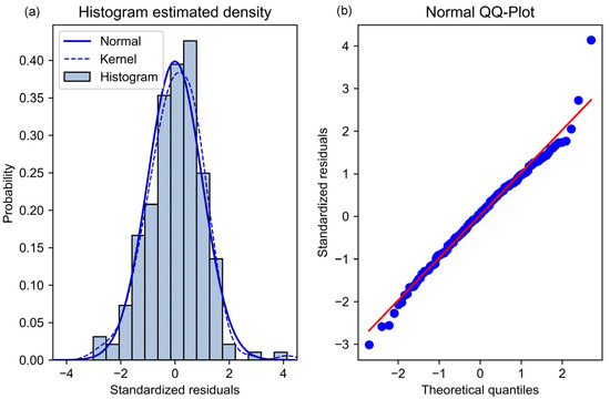 The parameter S of the SARIMA model is set to be 20 to represent the 200-year main cycle of the precipitation series. The SARIMA (0,1,1) × (0,1,1)20 is determined by the minimum values of the Akaike Information Criterion (AIC = 1643.20) and Bayesian Information Criterion (BIC = 1652.41), and they passed the residual normality test (Figure 7). The histogram of standardized residuals is in agreement with the normal curve, and the Quantile–Quantile (QQ) plot follows the normal reference line, demonstrating that the residuals are normally distributed. Simultaneously, the result of the Durbin Watson test is 1.96, suggesting that the residual information is not an autocorrelation and that the model is statistically valid.