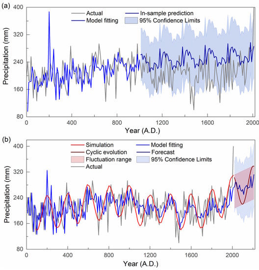To avoid the unclear changes caused by influences such as the industrial revolution or other human activities, it is beneficial to use a half-and-half method of split-sampling, which is the classical approach for validation in hydrology [56,57]. Thus, the precipitation series is divided into the train part (0–1000 AD) and a test one (1010–2010 AD) to assess the validity of the SARIMA model (Figure 8a). In the validation period, the actual values are included in the 95% confidence limits of prediction, albeit below the general in-sample prediction, which results from the capture of a near-term rising trend in the model prediction. This suggests a limitation that the model assumes that the time series continues to rise as before and cannot predict the change of trend, such as the rising and falling. The accuracy is tested by statistical evaluation, where the Mean Absolute Percentage Error (MAPE) is 0.26, the Mean Absolute Error (MAE) is 47.12, and the Root Mean Square Error (RMSE) is 58.21. These results indicate that the selected model and parameters are appropriate and reliable.