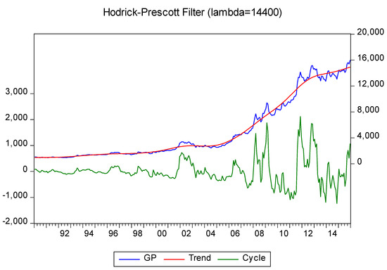 The first descriptive analysis was done to check the behaviour of gold prices over time. The graphical results from the Hodrick–Prescott filter are displayed in Figure 1.