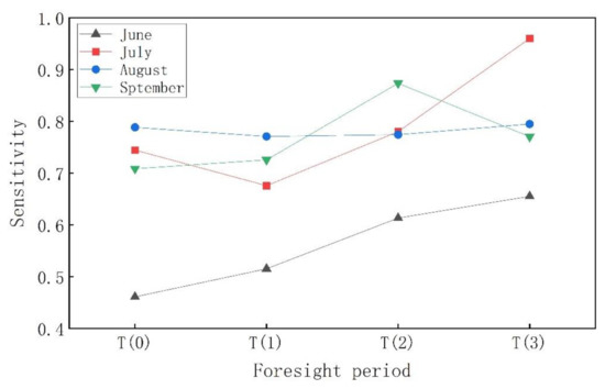 According to the results of sensitivity analysis, the higher sensitivity of the month of sunspot relative number to June, July, August, and September of runoff is March, April, May, and July. Jilin Province Hydrology and Water Resources Bureau (Jilin Province Water Environment Monitoring Center) releases annual flood season (June–September) inflow forecast in mid-April. Therefore, considering the factors of the foreseeable period, two groups of schemes are set up by taking into account the months of sunspot relative number, and the foreseeable period is shown in Table 3.