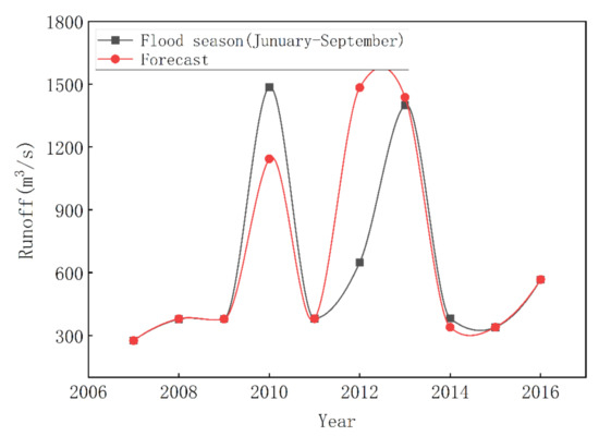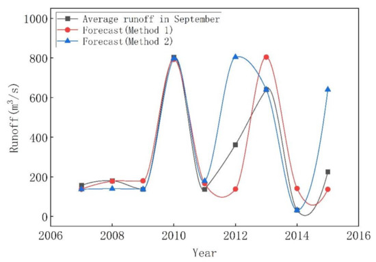 In 2018, the samples were trained based on the classification in the Baishan Reservoir; that is, the monthly average runoff in June–September was ranked into two groups: <500 m3/s and >500 m3/s for training. The corresponding forecast results were 400 and 404 m3/s.