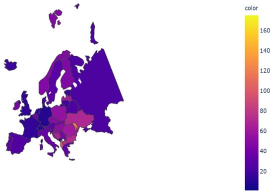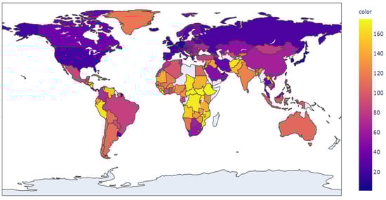 To generate the results presented in Figure 1 and Figure 2, the authors used the Plotly [] and Geopandas [] packages for Jupyter Notebook. In Figure 1, we can observe the distribution of the world’s countries by their digital development index scores for the year 2019. In the darkest color are the most-developed countries, and within the lighter colors are the least-developed countries. We can state that the most-developed countries were Europe and North America, and the least-developed ones were in Africa. A full list of the index values and the ranking of the countries is presented in Table A1 in Appendix A.
