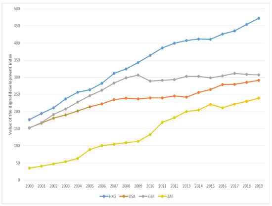 By analyzing Figure 3, we can see that in the case of South Africa, the digital development index saw a significant increase in the analyzed time period. The authors also observed the fact that the analyzed countries experienced growth in digital development, but the difference between Hong Kong and South Africa remained relatively constant for the analyzed time period. Moreover, the US, Germany, and South Africa were closer in the terms of digital development in 2019 compared with their positions in 2000.