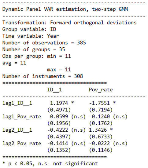 In order to quantify the influence of digital development on the poverty headcount rate, we decided to implement a panel data vector autoregressive model. The method of modeling using the vector autoregressive model was developed for the first time in the paper written by Sims []. The methodology has been improved since its introduction in 1980, and important landmarks are represented by several articles [,,]. One of the articles of interest in developing the present article is the one written by Andrews and Lu [], in which the methodology for GMM estimation on dynamic panel data models was developed.