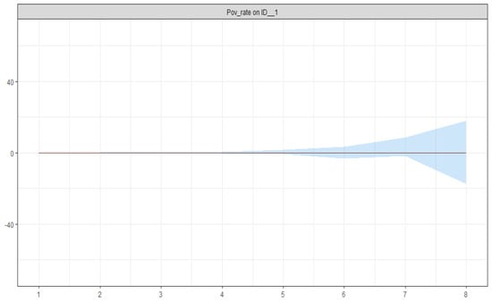 The results of the estimation of the model are presented in Figure 4. We can state that the poverty rate was influenced by the digital development index for both lags. For the first lag of the digital development index, the value of the coefficient was −1.7551 and was significant for a threshold of 95% for the poverty rate headcount. Moreover, the second lag of the digital development index was significant in the equation for the poverty rate, having a value of 1.3426. Consequently, we can state that the values of the poverty rate headcount were influenced by the values of the digital development index, with the value of the index in the previous year exerting a significant influence on reducing the poverty rate headcount, and the coefficient for the second lag indicated a positive influence on the poverty headcount rate. This could be due to the fact that the time interval was short and may have presented contradictory phases of the evolution of society.