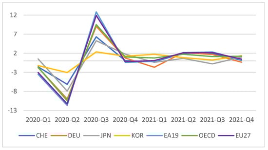 In Figure 6, the authors depict the evolution of the economic growth values for four countries that were considered to be in the category of the most-developed countries from the studied sample (Switzerland, Germany, Japan and South Korea) and compared them to the average of the countries that are members of the OECD, European Union and the euro area.