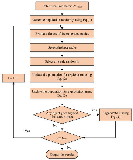 The position of the ith eagle in the search space is represented by . Furthermore, and represent the variable’s lower and upper limits, respectively. A random number between 0 and 1 is called rand.